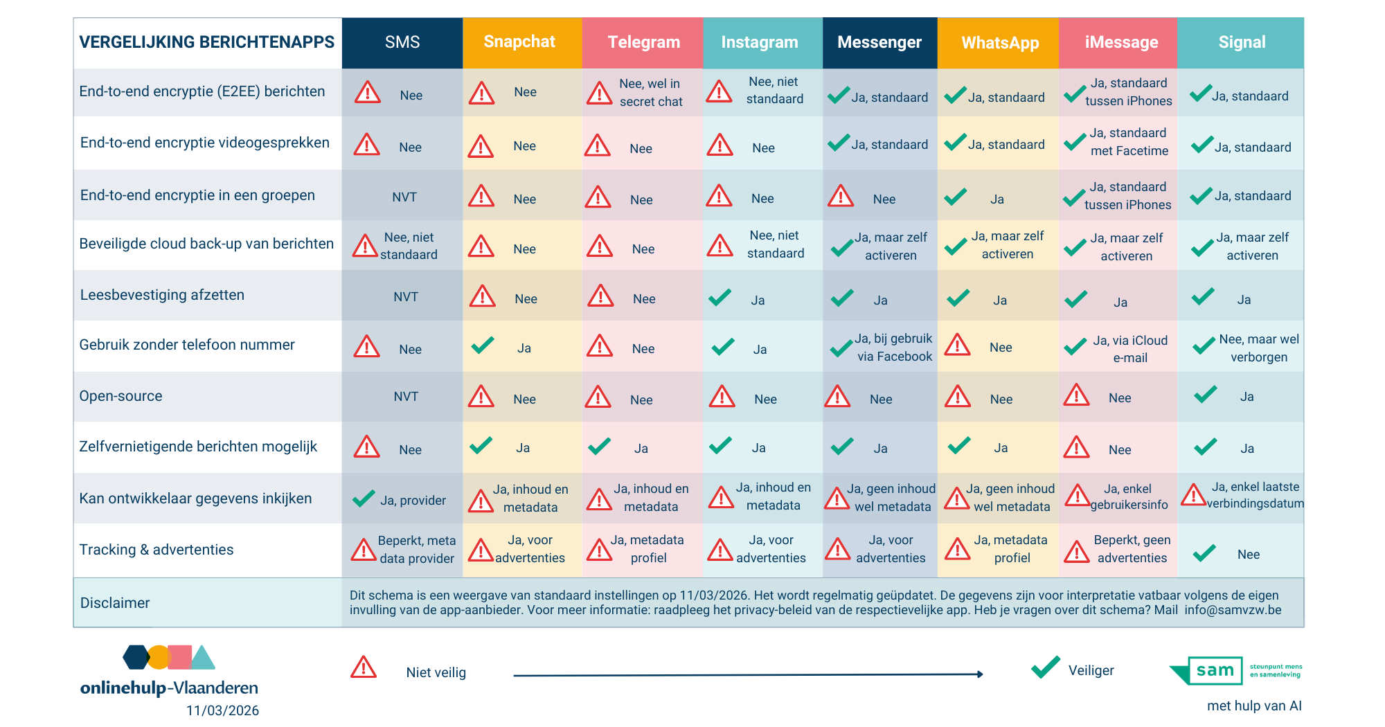 Voor wie als hulpverlener veilig wil communiceren met cliënten is Signal de beste keuze. WhatsApp en Messenger kunnen mits aangepaste instellingen gebruikt worden, maar hulpverleners moeten cliënten informeren over metadata en tracking.